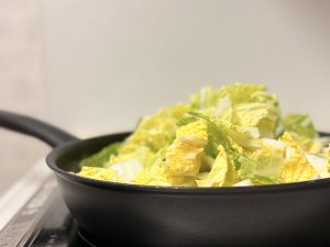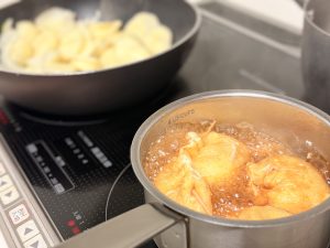 2口のコンロで回していると、三品目作る材料もカットし終わり、時間ができる。