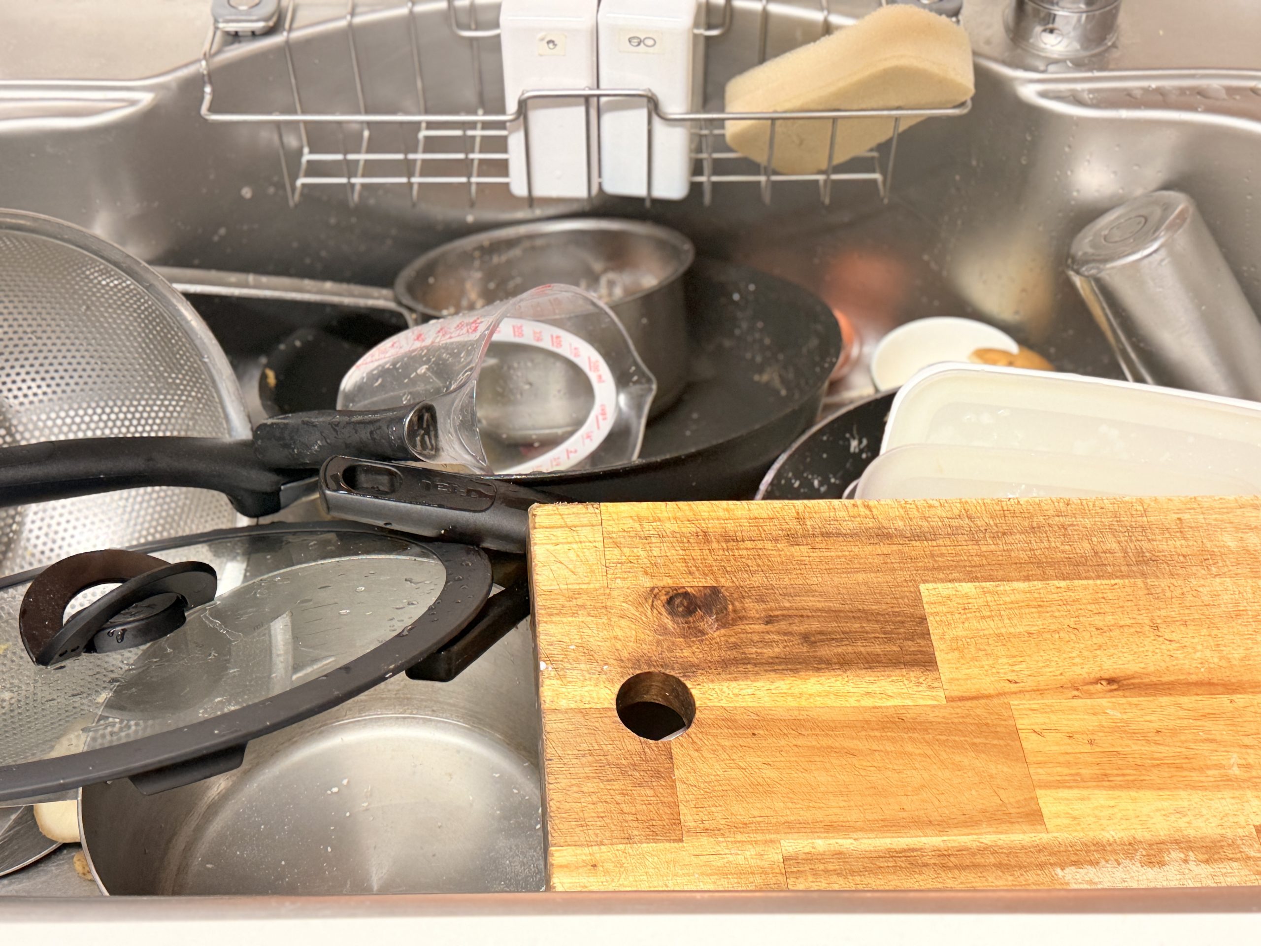 この時間でできることは、シンクにある、下ごしらえで使ったまな板、包丁、ざる、