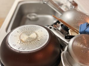 シンクに第二弾で残っている、フライパンや鍋やおたまなどの洗い物を洗う。