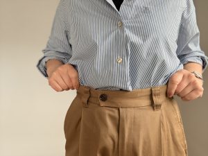 反対に、ウエスト部分と太ももから裾にかけてキュッとすぼまる形。