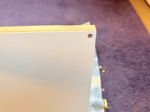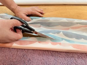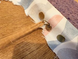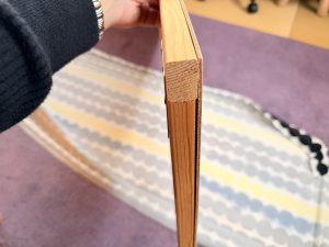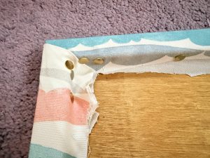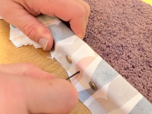 ④での生地を貼っていく作業は、テンション(ひっぱり)をかけながら留めていくと綺麗に仕上がる。