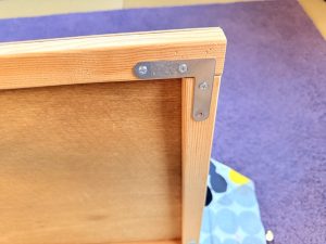 ベニヤ板に額の板をネジで留め、L字金具で固定している。